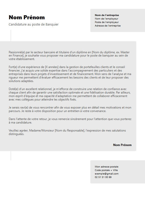 Passionné(e) par le secteur bancaire et titulaire d’un diplôme en [Nom du diplôme, ex. Master en Finance], je souhaite vous proposer ma candidature pour le poste de banquier au sein de votre établissement.